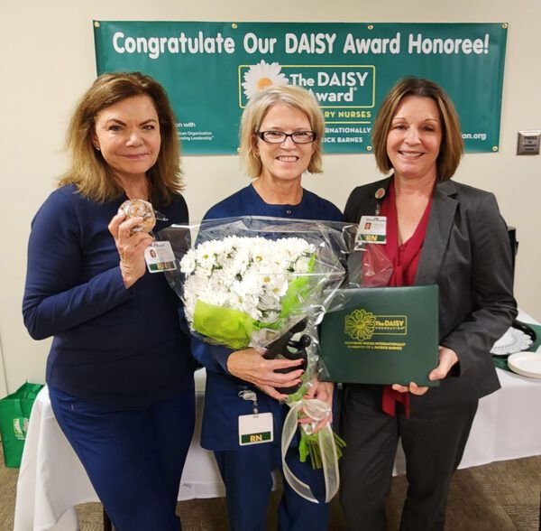 Left to right: Surgical Nurse Navigator Yvette Bailey with a cinnamon roll (a DAISY award ceremony tradition); DAISY award recipient Mary Burton, RN; and Chief Nursing Officer Pam Poulin, MS, RN, CENP.